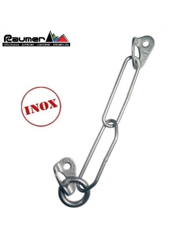 Grupo descuelgue inox. de la marca Raumer con un solo anillo de rapel. El uso de este descuelgue supone el uso de un mosquetón personal para su uso en "top rope", que eventualmente se recuperara una vez terminada la escalada. Si se instala en un eje idóneo, nada impide de usar el único anillo en la clásica “moulinette”.
